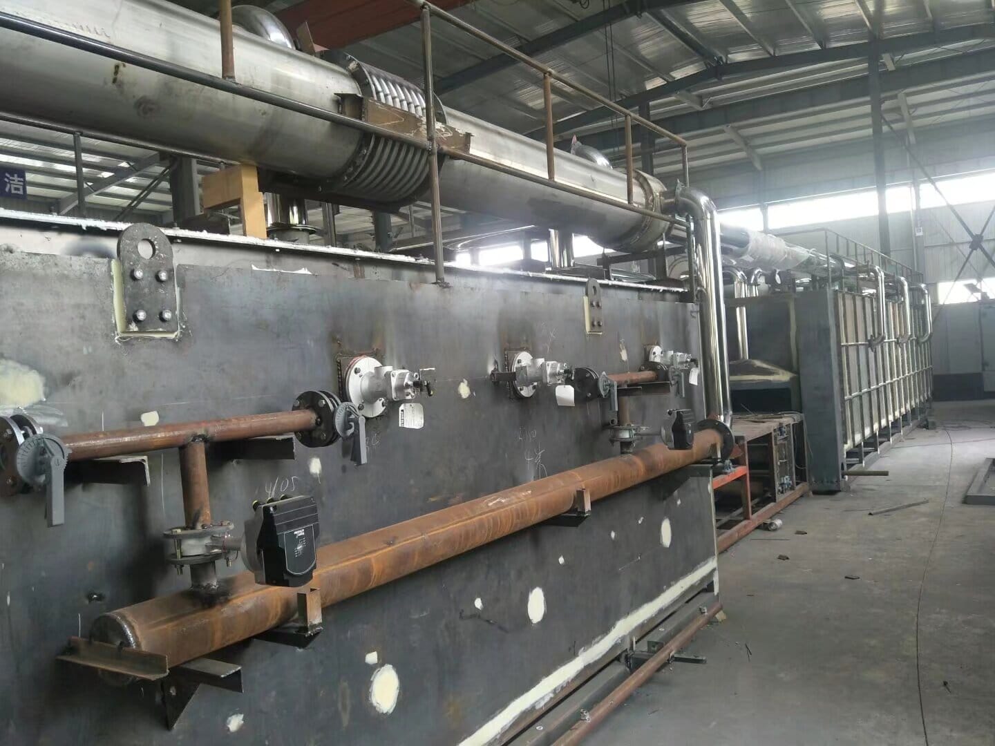 The natural gas-heated aluminum brazing furnace consists of a liquid storage tank, brazing flux spray and dryer, drying furnace, antechamber, brazing furnace, water cooling chamber, rear chamber, air cooling chamber, transmission, electrical controls for each section, and air intake and exhaust ducting.